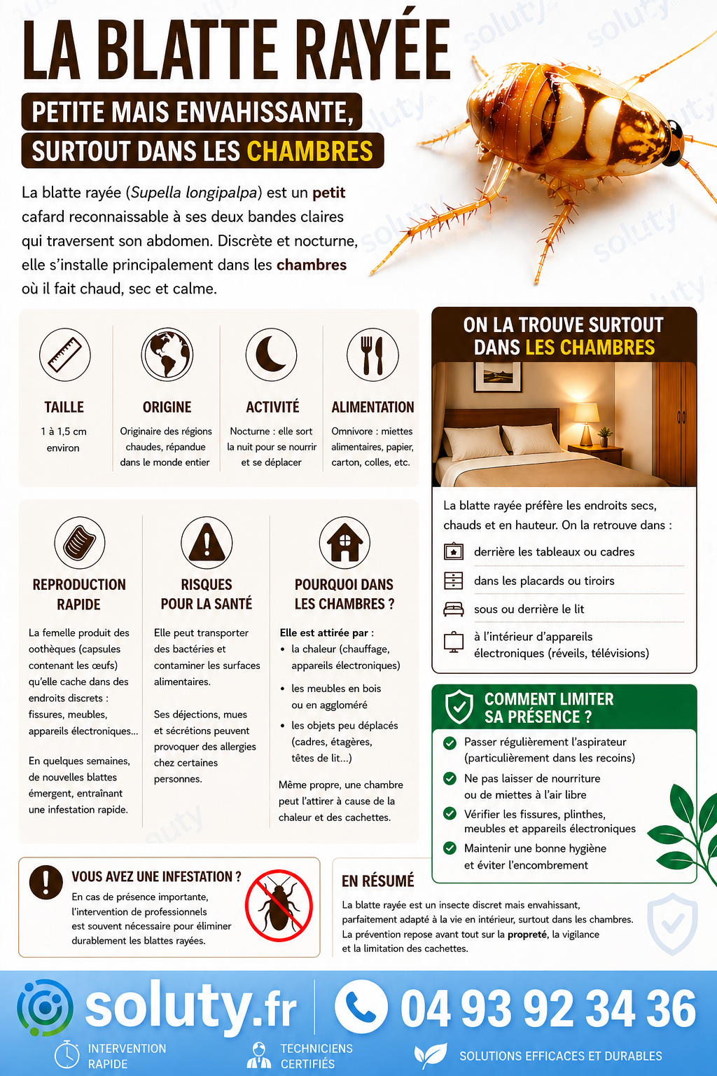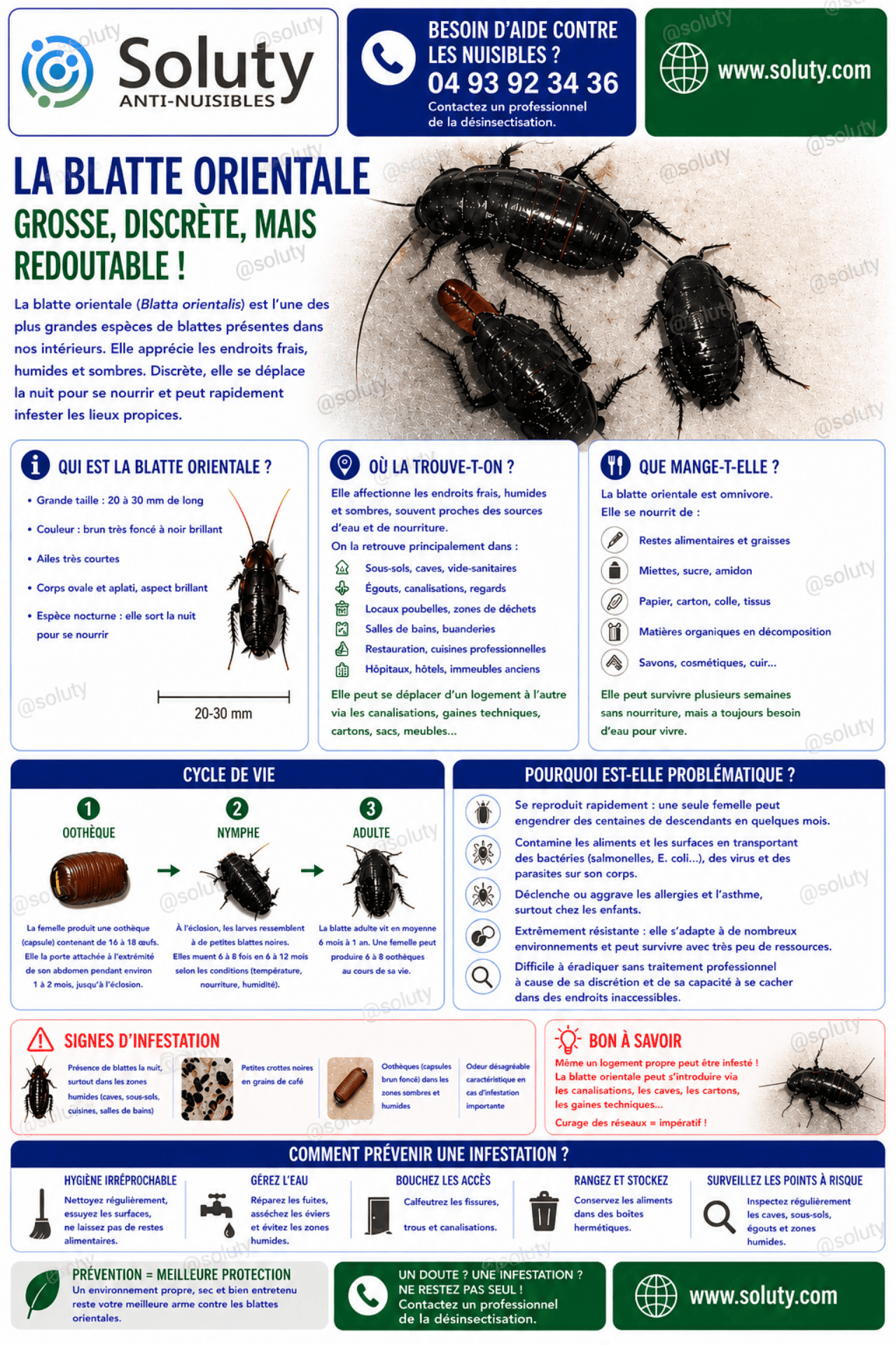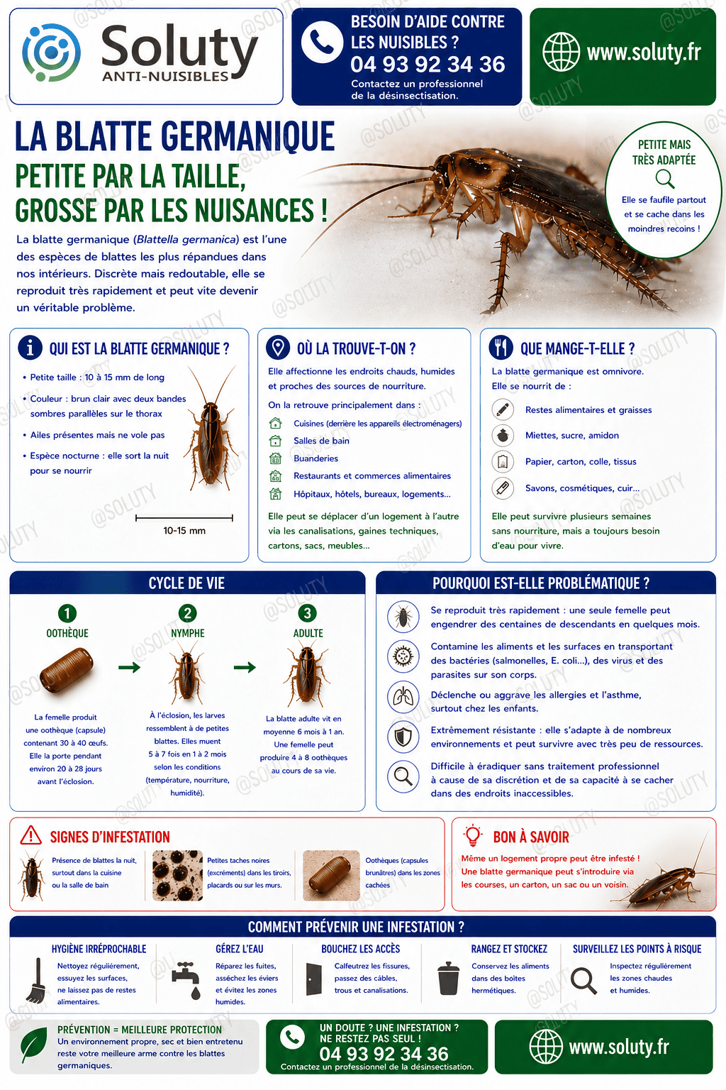 À Menton, plusieurs variétés de blattes sont régulièrement rencontrées dans les logements et locaux professionnels. La blatte germanique est la plus courante, particulièrement présente dans les cuisines et salles de bain, où elle se reproduit très rapidement.