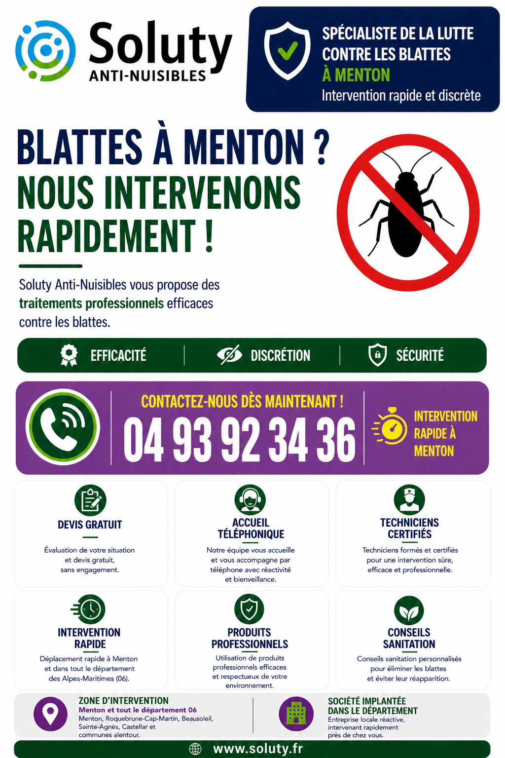SOLUTY est une société spécialisée dans la désinsectisation et la lutte contre les nuisibles intervenant sur la commune de Menton.